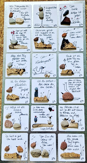 Wenn ich meiner Kreativität freien Lauf lassen kann, vergesse ich Zeit und Raum, erwecke Kieselsteine zum Leben und halte Momente, Gedanken und Worte fest. Zu sehen und zu hören, welche Freude meine Arbeiten bereiten und welche Emotionen und Reaktionen sie hervorlocken können, ist für mich das schönste Geschenk meiner kreativen Arbeit.