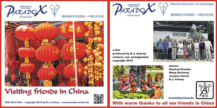 Die PARADOX Künstler B.J. Antony, Jacques Oerter und Manfred Schaller unterwegs mit ihren Freunden in China. Eine wunderbare Rundreise eröffnet sich: Jixian, Panshan Berge, Tianjin, Shanghai, Suzhou, Hangzhou. Sehenswürdigkeiten, Malaktionen, Künstlertreffen, Ausstellungseröffnung, Atelierbesuche, Freundschaft, Rundfahrten, Museen, „Bauhaus“ in China, Alltagsleben, Tanzen, Singen, Feiern und vieles, vieles mehr. Zum Staunen und Genießen im Reich der Mitte.